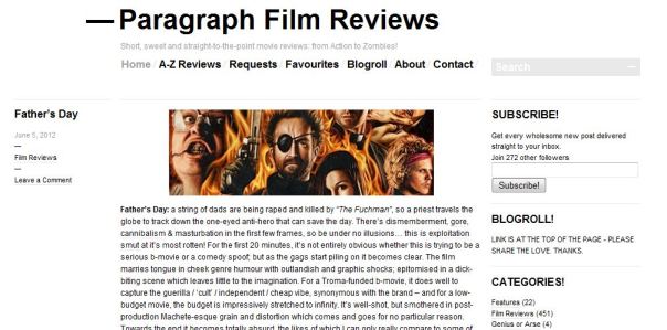Paragraph Film Reviews: I started the site a few years back as nothing more than a way of keeping track of the films I watched – up to 3 a day at my peak. The first year was essentially increasingly long scribbles of memorable moments / things I could look back after a few years and recall what the film was, and how good it had been (I’ve got a terrible memory). Luckily for me the hits started to pick up so I tried to formalise the reviews a bit more, eventually adding pictures and some more features, blogathons and one-off articles for more readability.