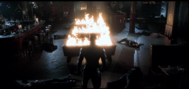 The fights in the movie were all rather varied with different degrees of success. I think no one would disagree that the first fight as Daredevil in the biker bar was the best one. It had such a great mix of action, style, and visuals. Not only that, but it really amped up the sound design of the fight, really playing with the sound choices to help get inside the head of Daredevil as he fights. The gunshots are all muted, and the sounds of an escaping Quesada are amplified. It really creates a unique atmosphere for the fight that is nowhere near topped throughout the entire rest of the film. I also remember the film when it came out being applauded for its unique, yet appropriate, blind radar sight visuals. I just wasn’t quite as impressed with them now than I was when I first saw them. The one thing that I still do appreciate is the all too brief glimpse into an independent, blind life. I would have loved to have seen more little touches like they did with the boxes of sorted paper money being folded in specific ways so he can tell them apart by feel.