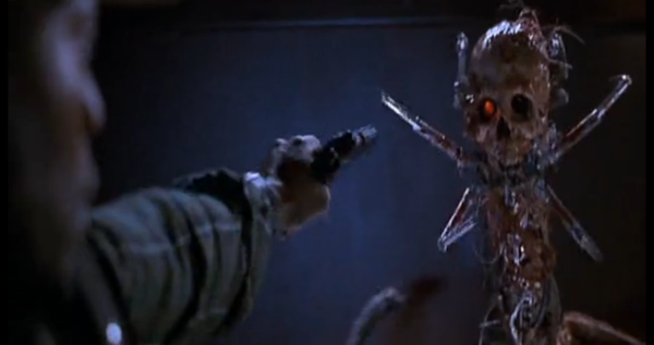 What this film does have going for it are the special effects, while the early part of the film has several different erector-set looking spider robots that are obviously just basically slightly more advanced versions of remote controlled toys you could buy at Radio Shack. The main difference is that they aren’t remote controlled, but instead they have a large wire connected to the back of them. A wire that is actually explained as a part of the story. But as the film goes along, the creatures get larger and more elaborate, including a couple that use many parts from a couple of the crew members themselves. When it gets to what’s referred to as the Goliath creature, not only is it huge, but it’s effect is achieved through a variety of effects. It’s not only a giant animatronic controlled through puppetry, but there are moments where it moves way too fast and fluidly for it to have been done on-set. And the transition between the practical robot and the CGI-enhanced creature effects are more or less seamless. Not only that, but the designs of all the creatures and robots besides some of the smaller ones really are something to behold. It’s very reminiscent of the Borg, only much less humanoid in places and very gruesome.