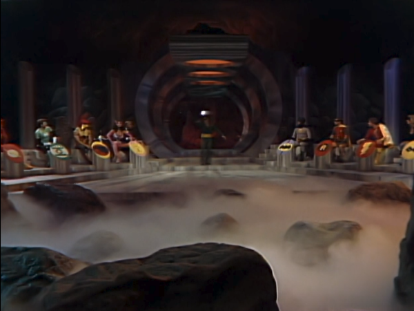 The basic premise is a classic variety style show that stars the Justice League consisting of: Adam West’s Batman and Burt Ward’s Robin, Green Lantern, The Flash, Hawkman, The Huntress, Captain Marvel, and Black Canary. And they’re facing off against a group of supervillains that aren’t exactly given a group name that consist of: Frank Gorshin’s Riddler, Mordru, Dr. Sivana, Giganta, Solomon Grundy, Sinestro, and Weather Wizard. And while the heroes get an announcer to introduce all of them one by one in an opening credits fashion, the villains go through a comedy sketch style roll call. The Riddler goes through each of the villains one by one and gives them what’s supposed to be a riddle-like introduction but basically just describes them, followed by the villains saying their name and/or attacking Riddler in order to show off their powers. Like everything else involved in this special, it was just a lazy and cheap way to introduce all of the villains who were basically unknown at this point except to comic book fans.